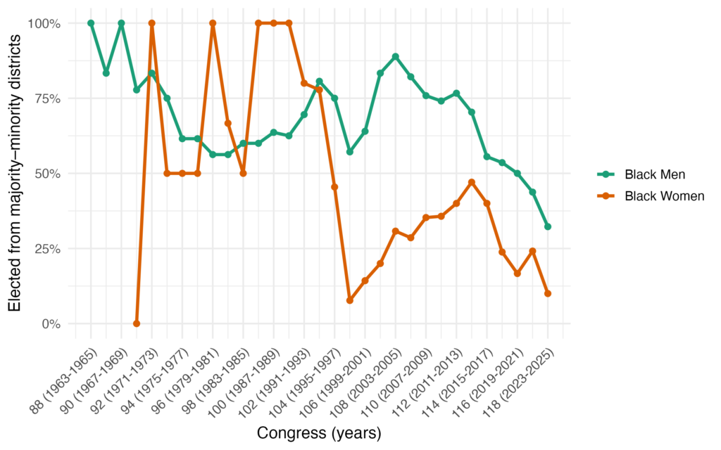 This highlights an important dynamic. Black men’s representation remains closely linked to the Voting Rights Act’s protections for majority-minority districts. Yet for Black women, representation increasingly reflects broader, multiracial constituencies. Therefore, any additional weakening of the VRA would likely disproportionately harm Black men’s political representation, even as Black women continue to make electoral gains in more diverse districts.