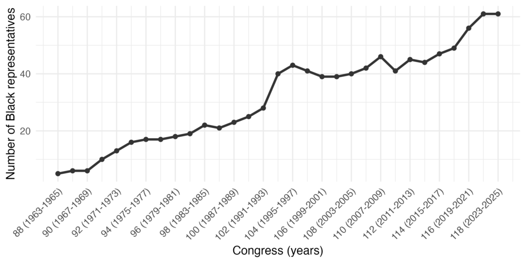 Figure 1 shows the growth of Black representation in the U.S. House of Representatives over the past 60 years. Starting with just five Black members in the 88th Congress (1963–1965), the number has steadily increased to 61 in the 118th Congress (2023–2025). Although progress was gradual in the 1970s and 1980s, redistricting reforms and the amendments to the VRA since 1990 have now led the most racially diverse Congress in U.S. history – the 118th Congress (2023–2025).