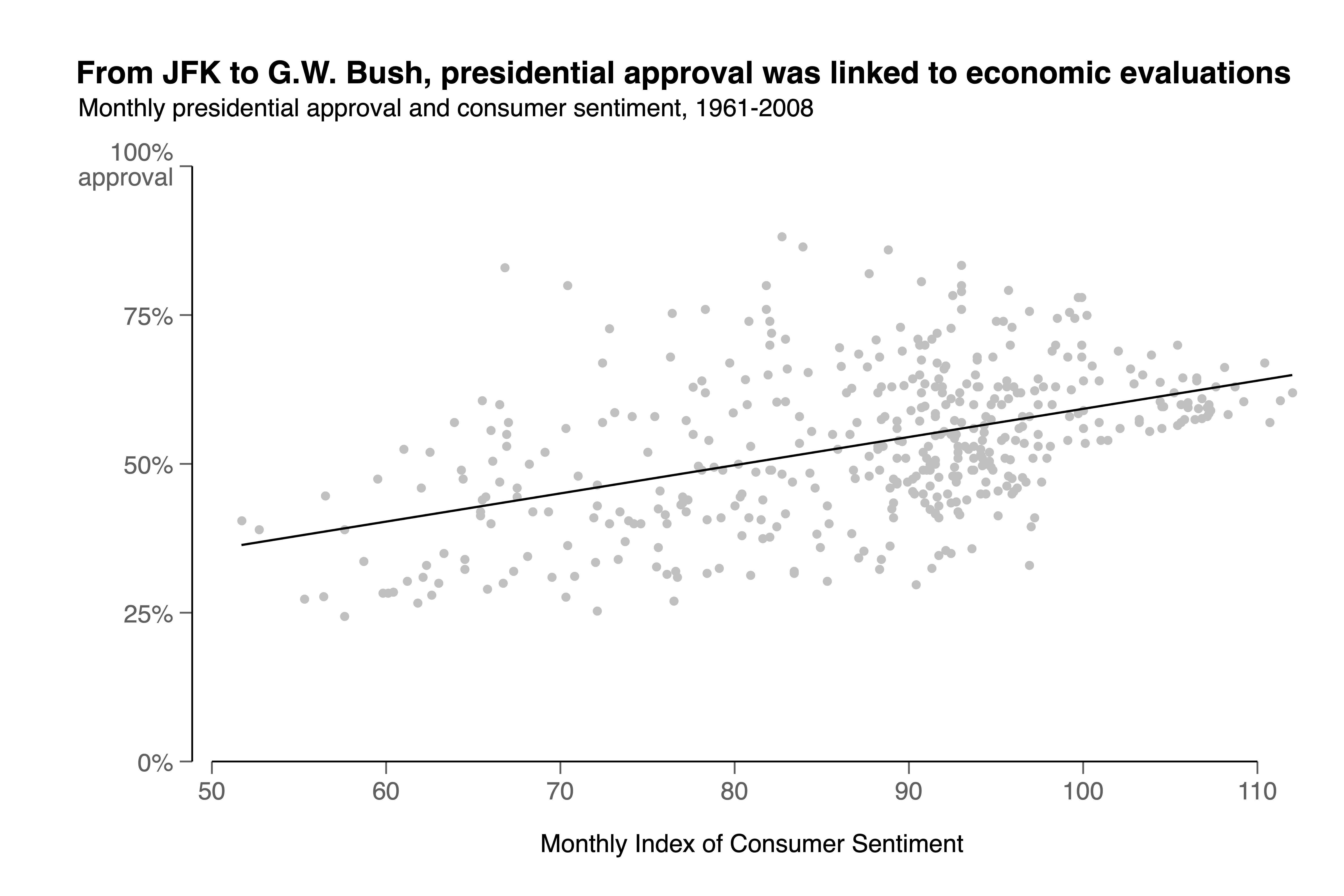 For all the presidents from John F. Kennedy to George W. Bush, higher levels of consumer sentiment were associated with higher levels of presidential approval, as the figure below shows. To measure average monthly presidential approval ratings, we relied on compendiums from various scholars, HuffPost Pollster and, more recently, FiveThirtyEight.